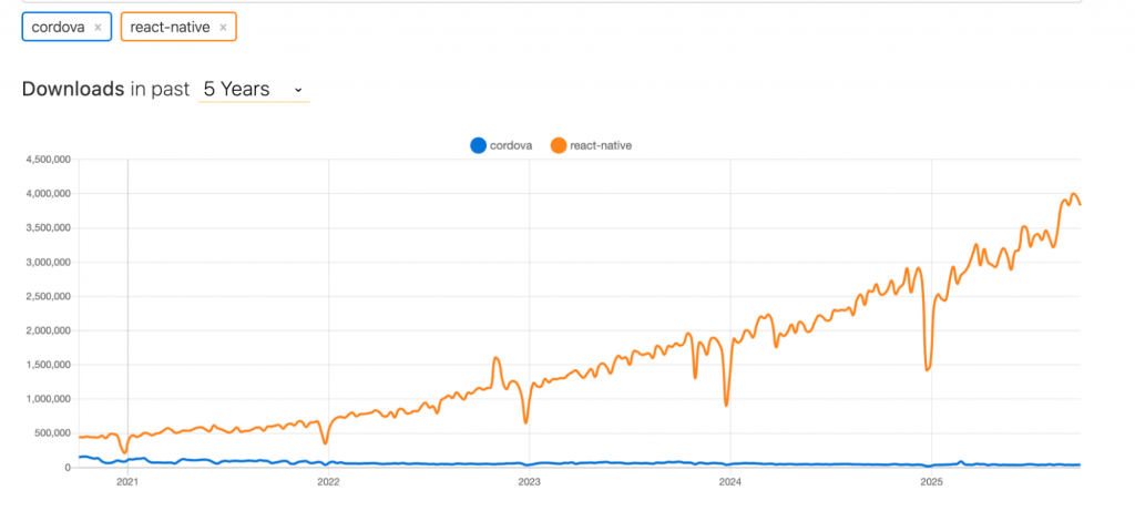 Many developers find Cordova’s ecosystem shrinking. The sustained decline in Cordova’s popularity compared to React Native’s dominance clearly signals a market-wide shift: