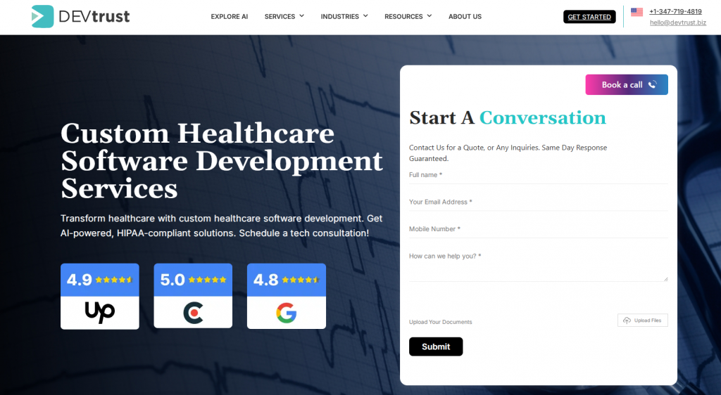 DevTrust builds EHR/EMR systems, practice management tools, remote monitoring apps, billing systems, telemedicine platforms, AI‑powered transcription tools that adhere to HL7, FHIR, HIPAA, GDPR, and other regulatory standards. They can also integrate healthcare systems with the existing CRMs, EHR, etc.