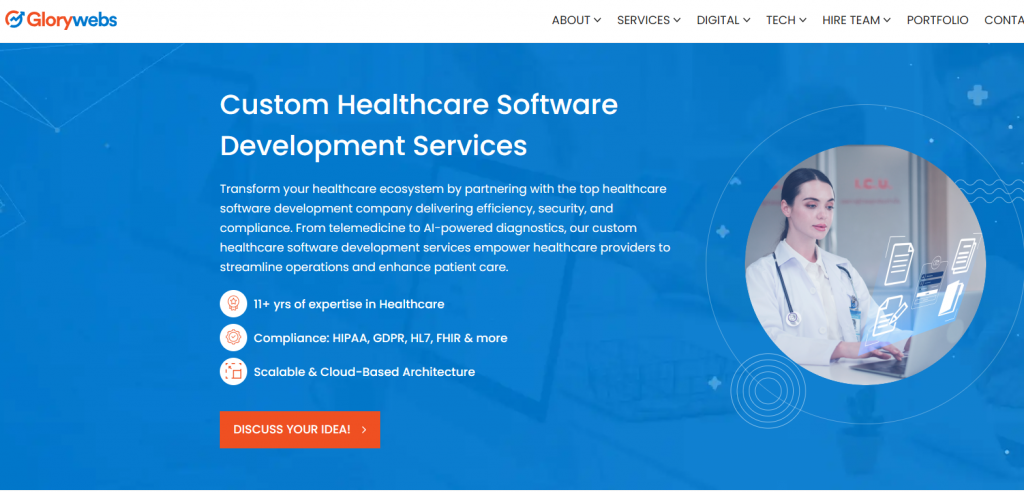 Glorywebs provides healthcare software tailored for hospitals, clinics, and telemedicine platforms. They build hospital and clinic management systems, telehealth solutions, appointment scheduling systems, and more – all of the following HIPAA, GDPR, HL7, FHIR and other standards.