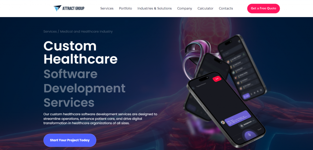 Attract Group offers healthcare software development services with a focus on innovation, scalability, and patient-centered solutions. The vendor has experience in developing medical imaging software for diagnosis and treatment planning, medical practice management systems, telemedicine platforms, and more.