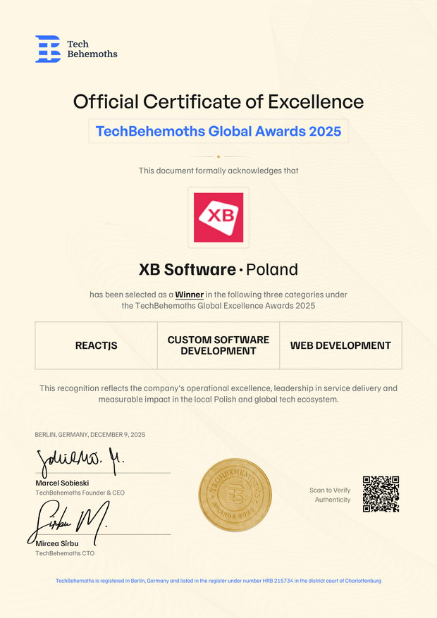 XB Software has won the TechBehemoths Global Excellence Award 2025, marking its fifth consecutive year of recognition as a top performer in custom software, React.js development, and web development. This achievement, reinforced by an official authorized certificate, highlights the company’s technical excellence, reliability, and long-term commitment to delivering scalable, secure digital solutions.