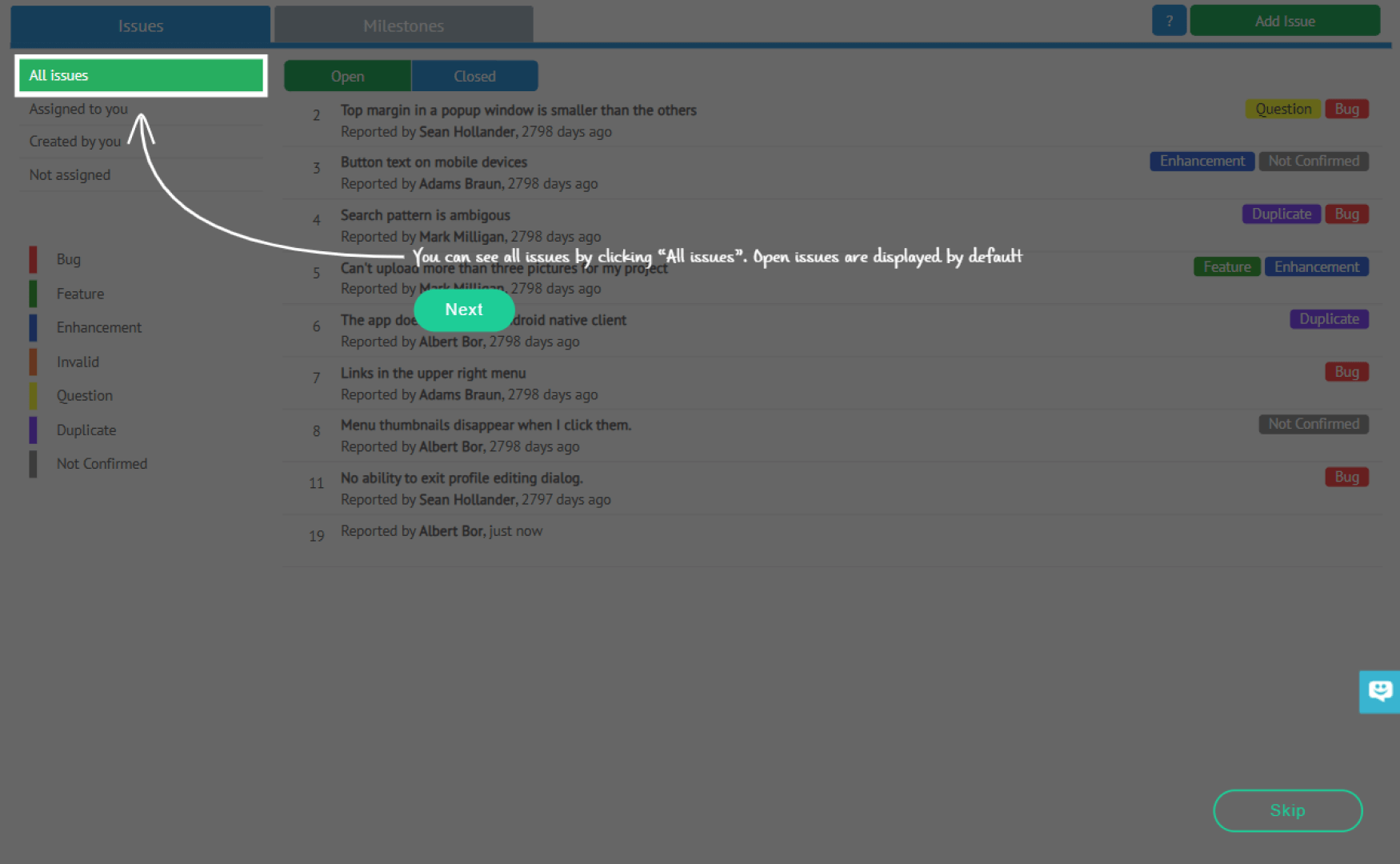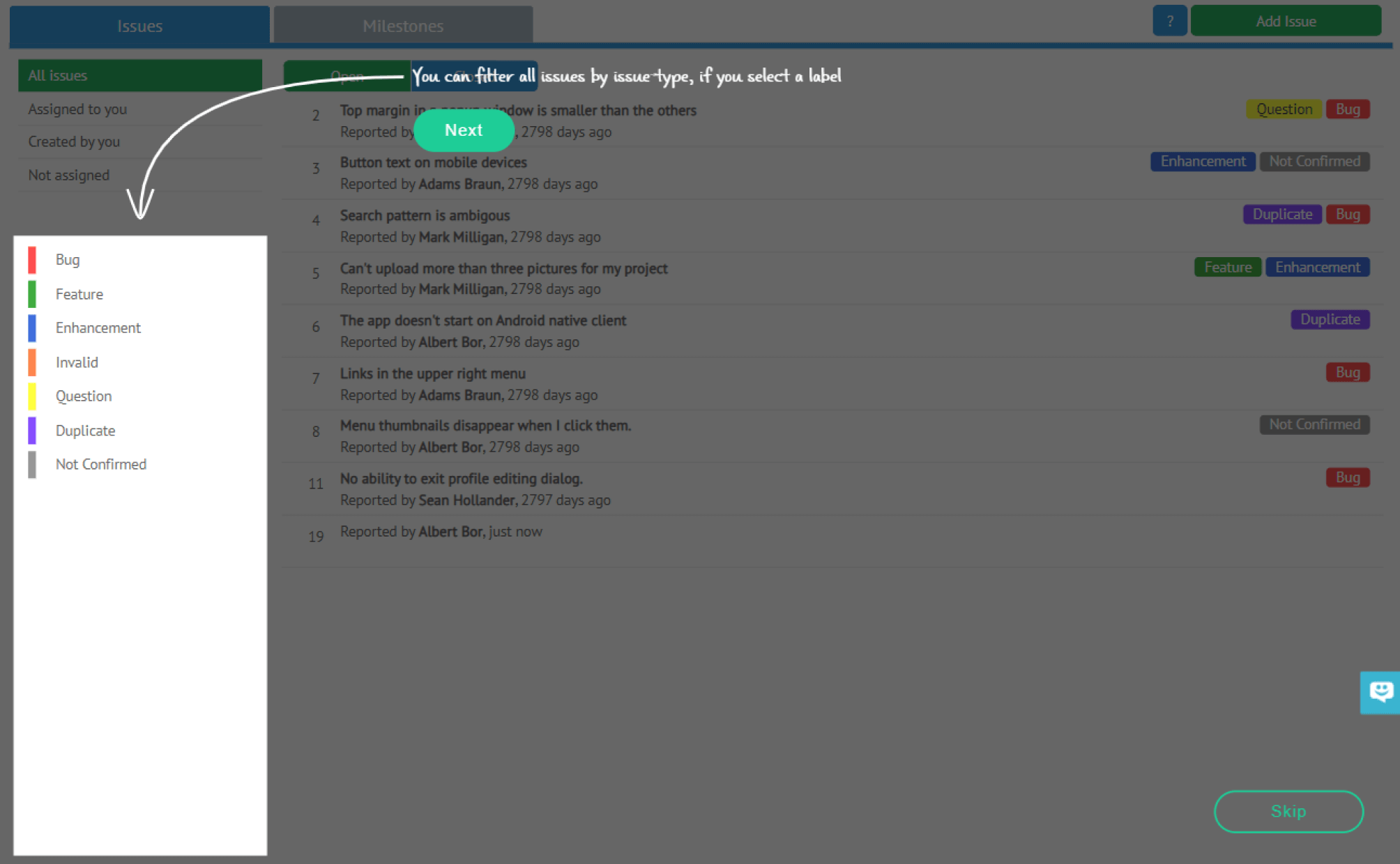 We demonstrated the use of the EnjoyHint web-tool in an issue tracker demo, created with Webix JavaScript UI library. The tool itself is based on Javascript, HTML5 and CSS. The tool works on the client-side and can be used with any server-side platform.
